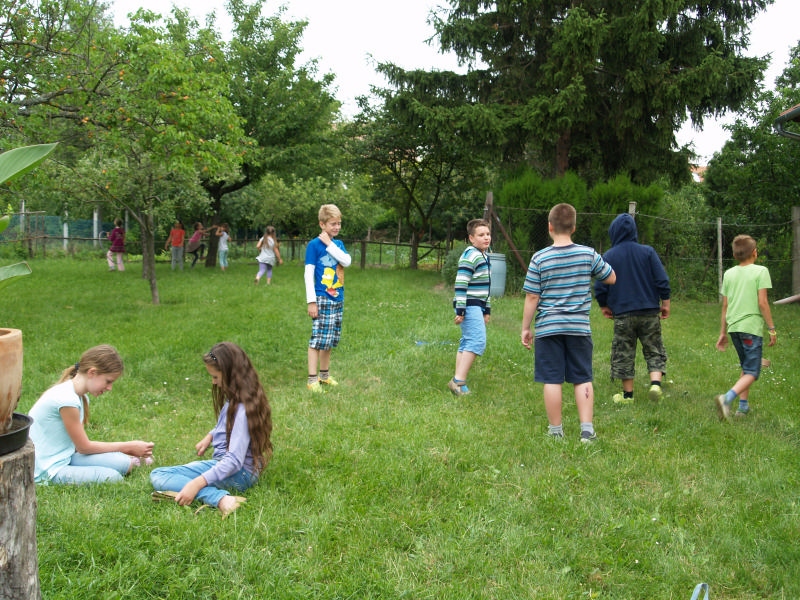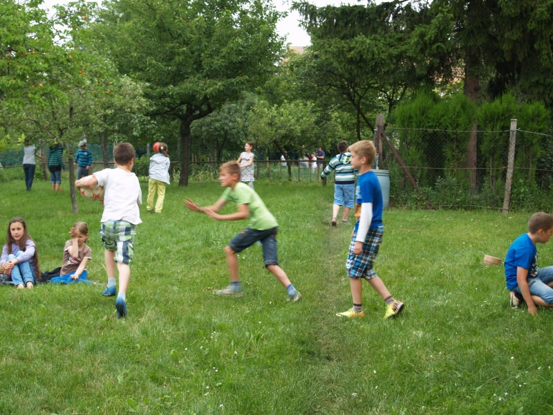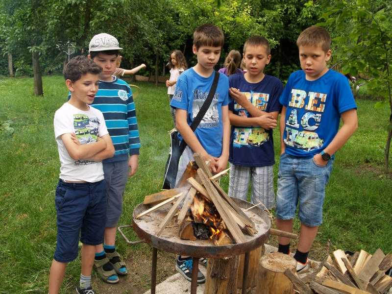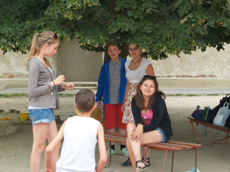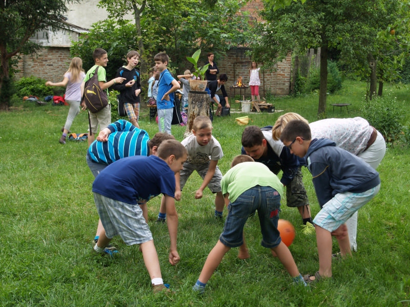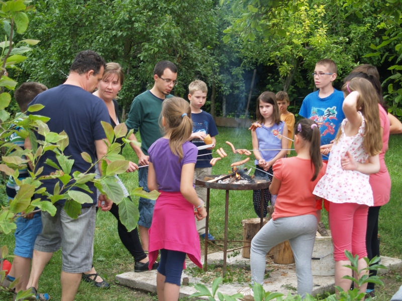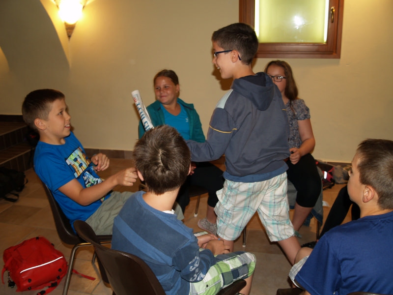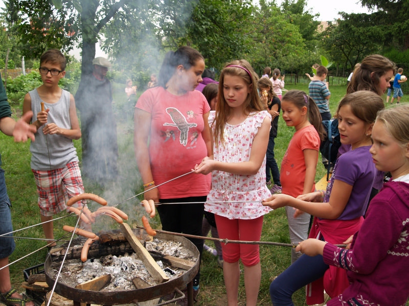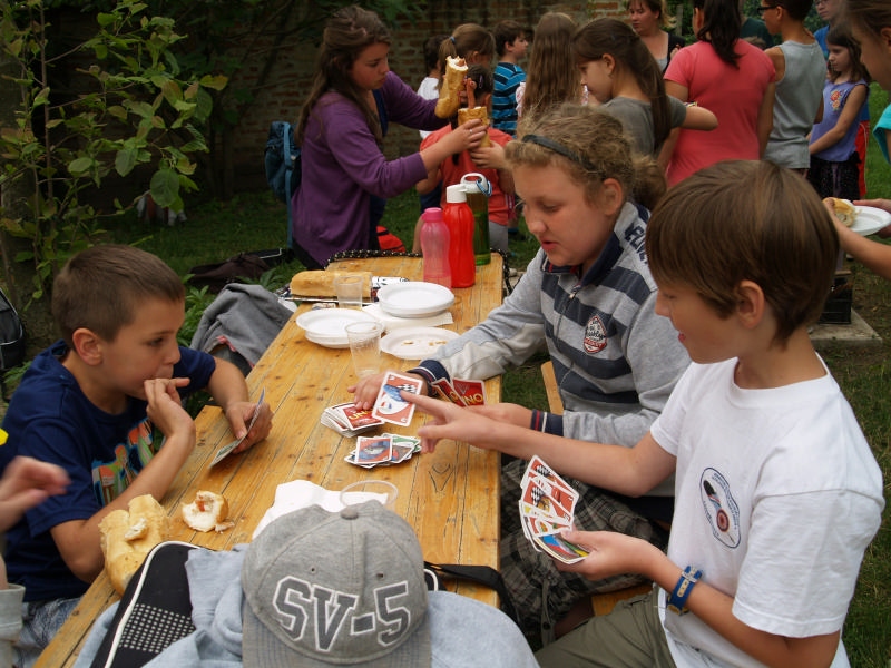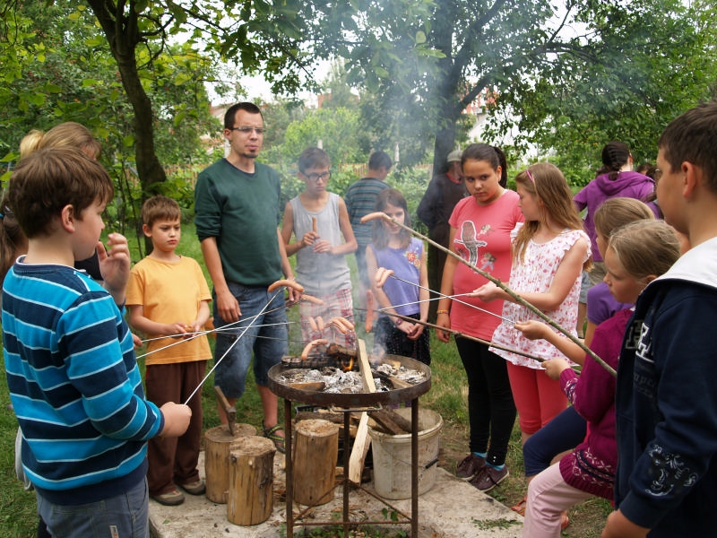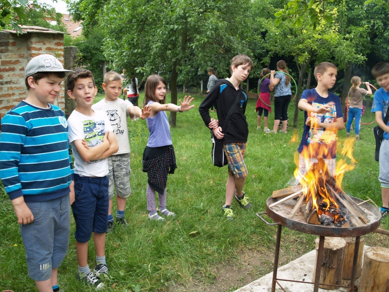 Sok beszélgetéssel, játékkal, tánccal és énekléssel telt a hittan tábor második napjának délelőttje. Ebéd után egy kis sportolás következett, majd a csoportok együtt mentek át Ági néniékhez, ahol megnézhettük, hogyan gondozzák a kertet, játszottunk, tűzet raktunk és sütögettünk is. Ez idő alatt a konfirmandusok az őszi konfirmációi vizsgára készültek.